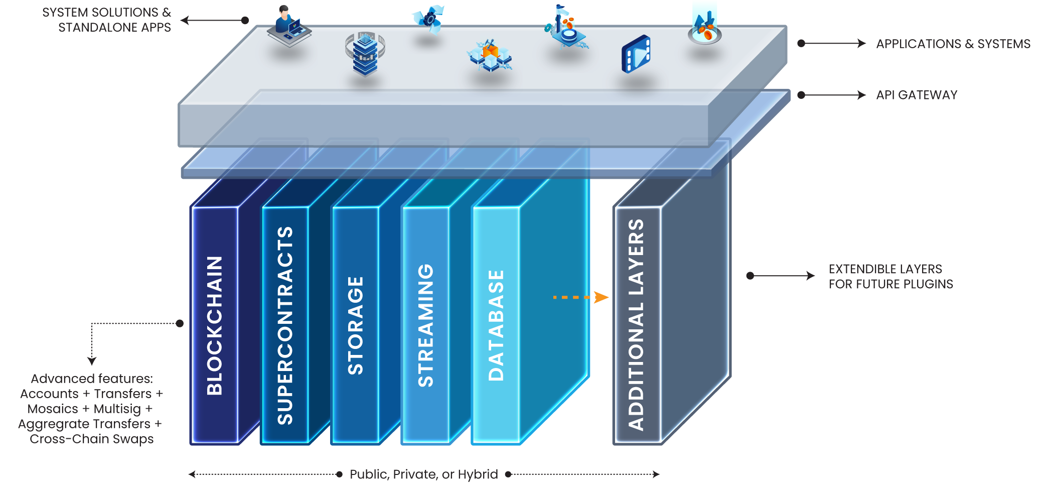 Una blockchain empresarial avanzada con funciones integradas tales como multicapas-multifirmas, transacciones de extracción, transacciones agregadas y capacidad entre cadenas para impulsar soluciones avanzadas.